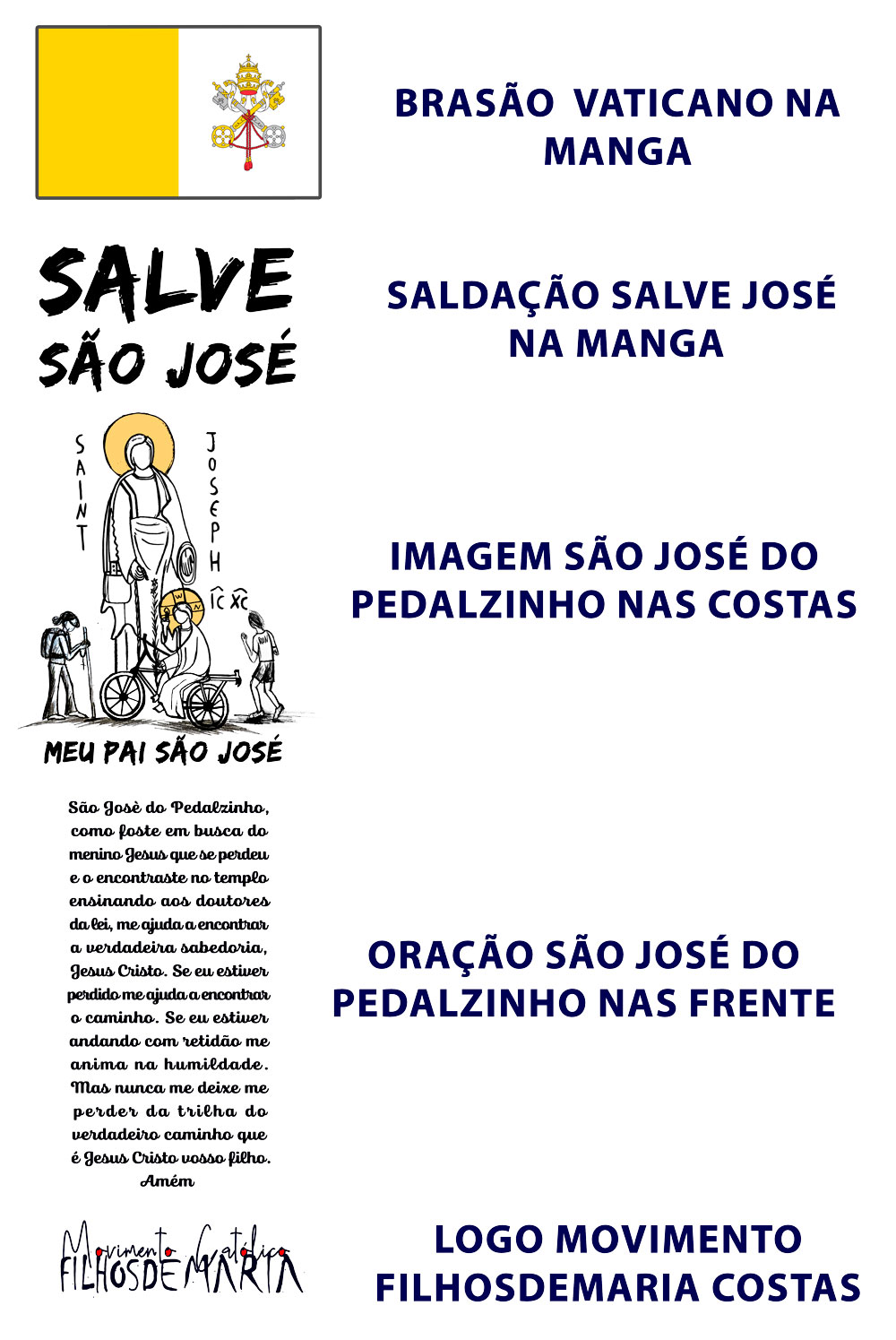 Camisa São José do Pedalzinho na parte frontal possui detalhes flores de lirios que representa a pureza de São José, com a oração completa. Nas mangas a bandeira do Vaticano e o brasão Movimento FilhosdeMaria.