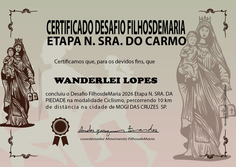 Será entregue certificado de participação e conclusão do Desafio FilhosdeMaria etapa Nossa Senhora da Piedade enviado via whatsapp formado PDF pronto para impressão, o certificado não será enviado para aqueles que não concluírem com êxito, cumprido todo regulamento do Desafio.