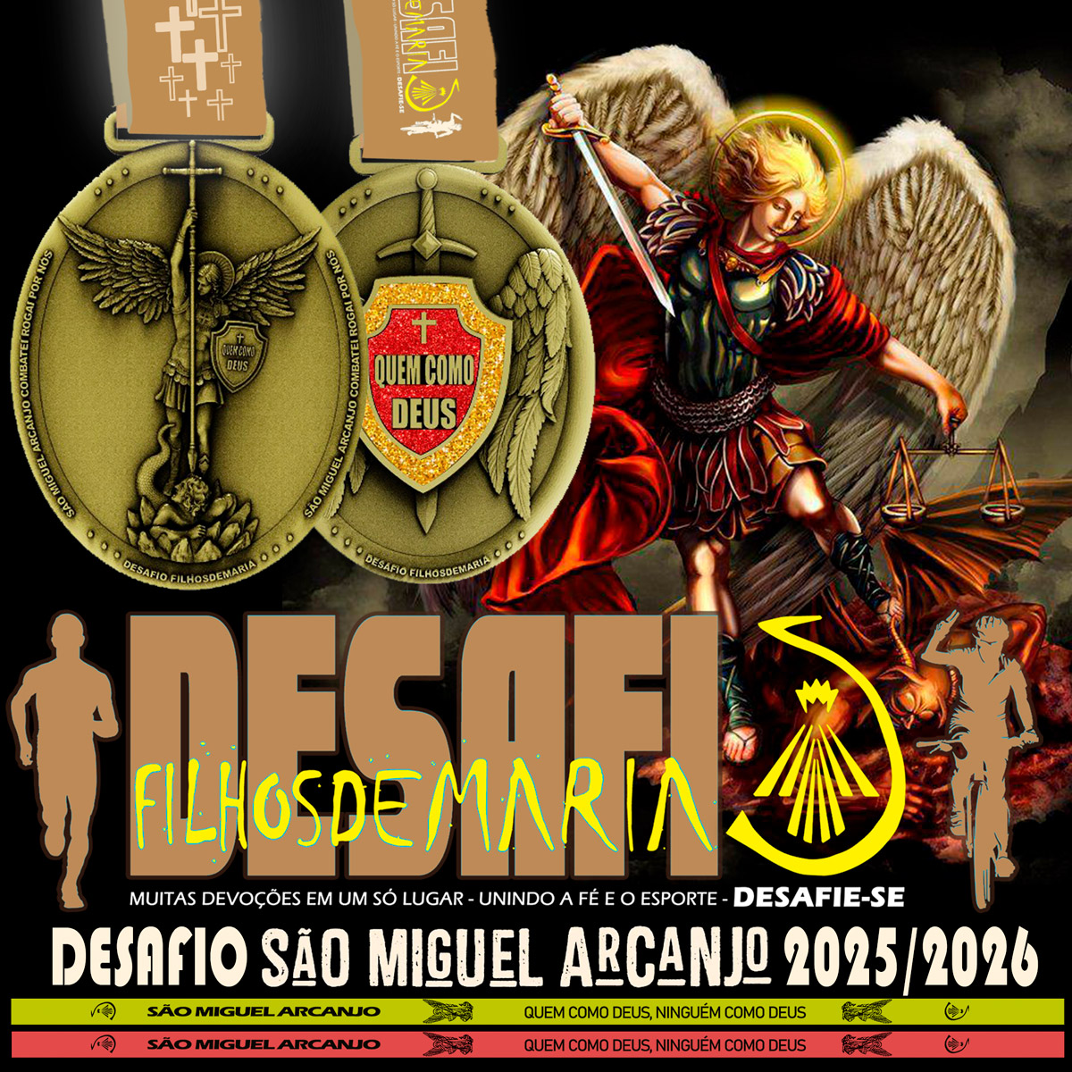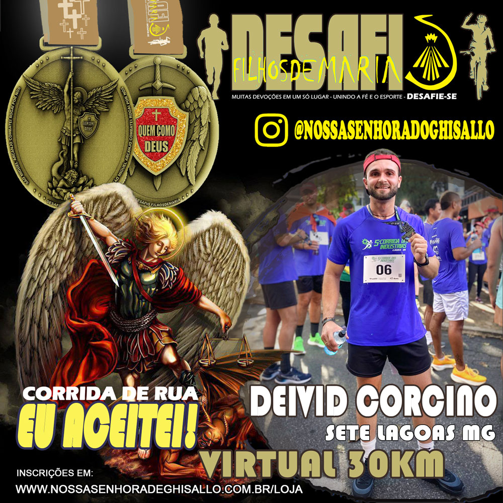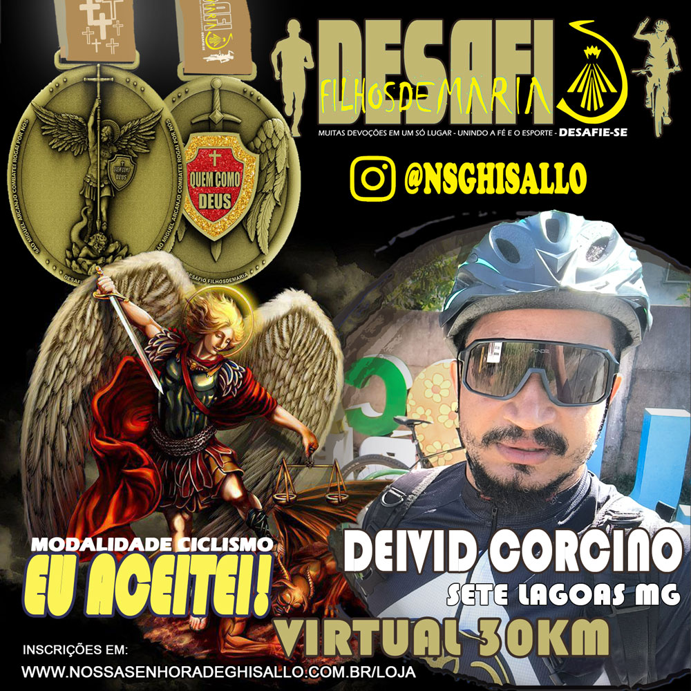 - Você deve escolher um trajeto que contenha algum símbolo Católico como altar, Imagens Sagradas, Capelas, Igrejas, Cruzeiro, etc “Qualquer símbolo no início, meio ou fim do seu trajeto” .Tire um foto ou video em frente esse símbolo Católico, ao estar em frente a este símbolo reze a oração de São Miguel Arcanjo +Três Ave Maria + Pai Nosso em intensão ao Movimento FilhosdeMaria e nossa missão e por uma intensão particular que você tenha em seu coração que você ira pedir a São Miguel Arcanjo que interceda por você junto a Deus. “A Foto ou Video em frente o símbolo Católico é obrigatório, o envio via Whatsapp junto com os prints de sua atividade fisica, tanto as fotos ou vídeos enviados podem ser divulgados em nossas redes sociais estando de acordo com o mesmo sem nenhum custo para a parte organizadora.