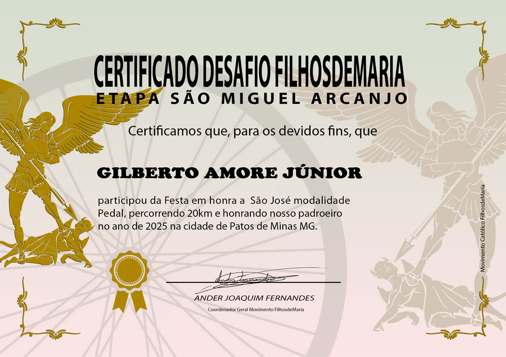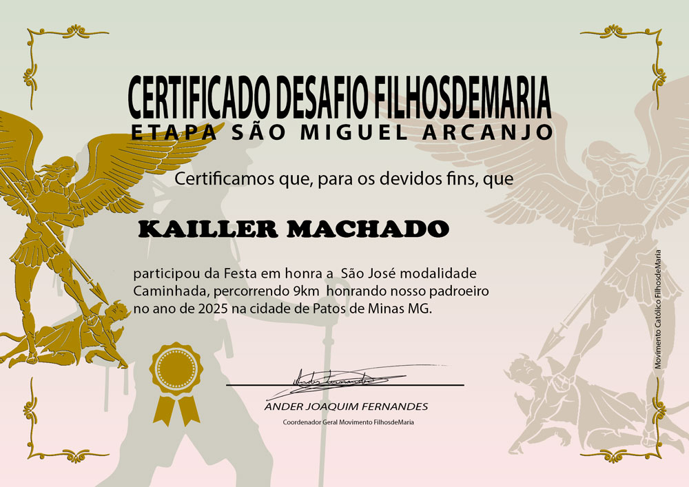 Será entregue certificado de participação e conclusão do Desafio FilhosdeMaria etapa São Miguel Arcanjo impresso no tamanho 21cm x 14,5cm protegido em uma caixa que será envidada juntamente com seu Kit, o certificado não será enviado para aqueles que não concluírem com êxito, cumprido todo regulamento do Desafio.