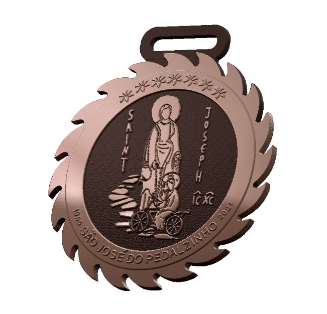 O medalhão Olimpiadas de São José do Pedalzinho tem tamanho 12cm x 12cm frente e verso sendo o maior medalhão de nosso Pai São José, a parte da Frente possui a imagem de São José do Pedalzinho na frete com seus filhos e filhas indo de varios lugares ao encontro de São José e do Menino Jesus, já na parte traseira a logo do Desafio FilhosdeMaria.